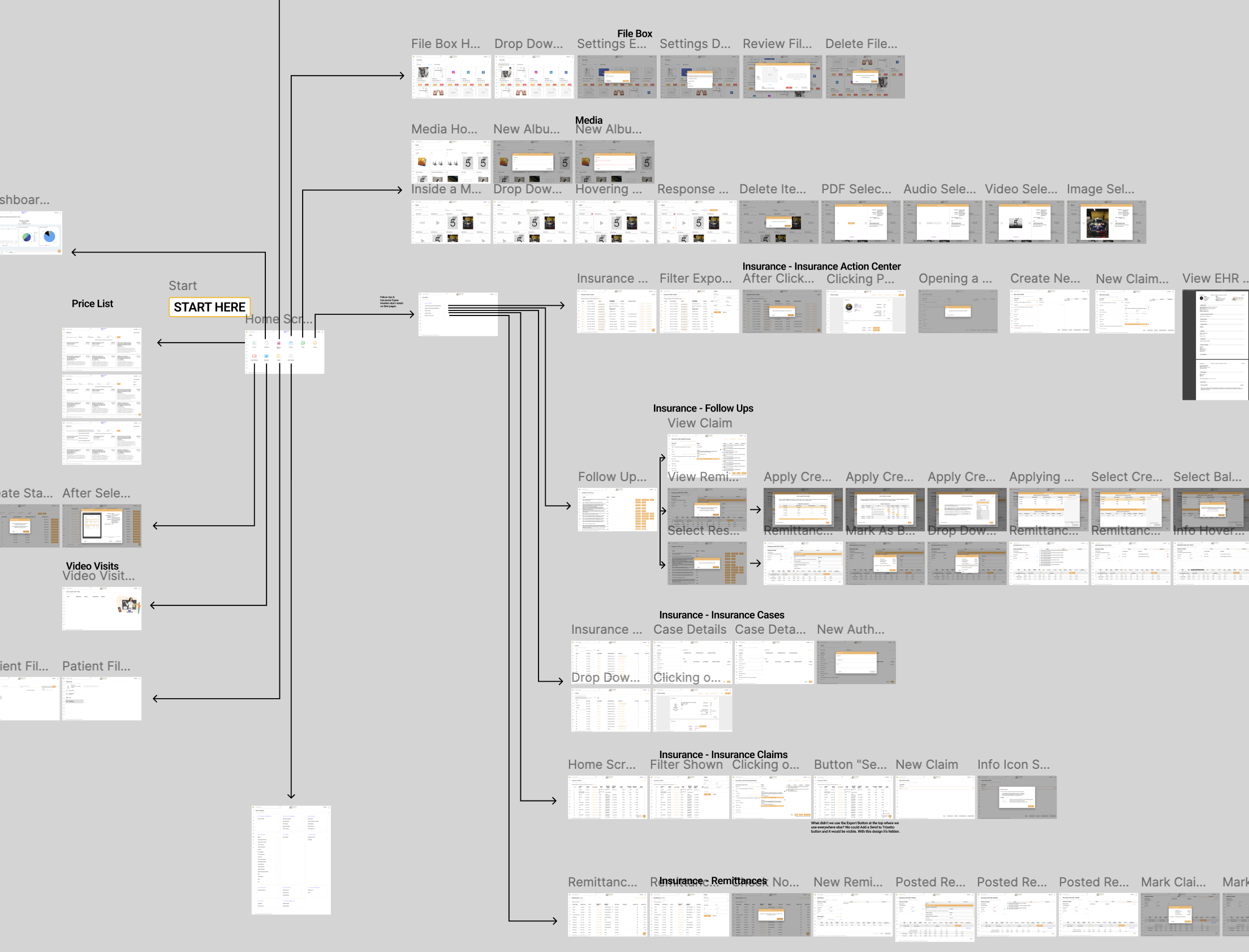 Rather than guessing at what the design system should contain, I started by mapping the entire product. I took screenshots of every screen and interaction and laid them out in a large Figma file — a visual web of the full software. Seeing everything at once let me absorb the product quickly, spot what icons and patterns were actually in use, and — critically — identify inconsistencies that no one had formally documented.
