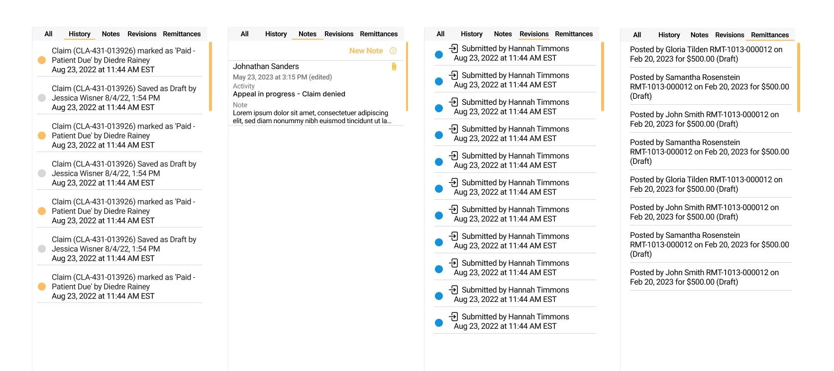 When a user opened a claim, the history section only showed who had last worked on the claim and when. While helpful at a glance, it didn’t provide any real context about what changes were made or why. I redesigned the history section to include meaningful details such as notes, remittances, and revisions made to the claim. I also included a filter at the top of the section to allow users to view only what they were looking for and cut down on unnecessary scrolling. This gave users better visibility into what had happened previously, reduced confusion, and helped teams pick up work more confidently without needing to track down context elsewhere.